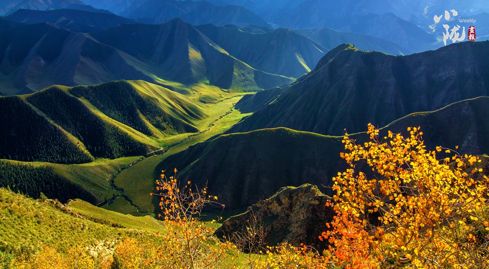 祁連主峰在藍天白云的映襯下顯得肅穆大氣。周圍群峰羅列、層巒疊嶂,高低延綿的山脈在陽光的照耀下交相輝映,近處的群山被此起彼伏的林海包圍,像一道道五彩的波浪,郁郁蔥蔥,生機盎然。