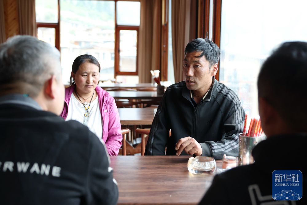 ↑ 扎尕那景區(qū)一家民宿經(jīng)營者卓瑪交(右)在自家的民宿里和員工交流如何提高服務(wù)水平(6月27日攝)。新華社記者 方欣 攝