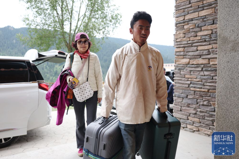 ↑ 扎尕那村一家民宿工作人員仁青(右)幫助前來住宿的游客搬運(yùn)行李(6月27日攝)。新華社記者 陳斌 攝