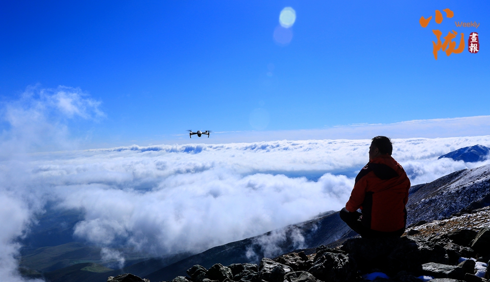 雪山山巒間,云霧回旋飄動(dòng),彌漫舒展,如海浪起伏、波濤滾滾一般,與湛藍(lán)天空相互映襯,壯美如畫。