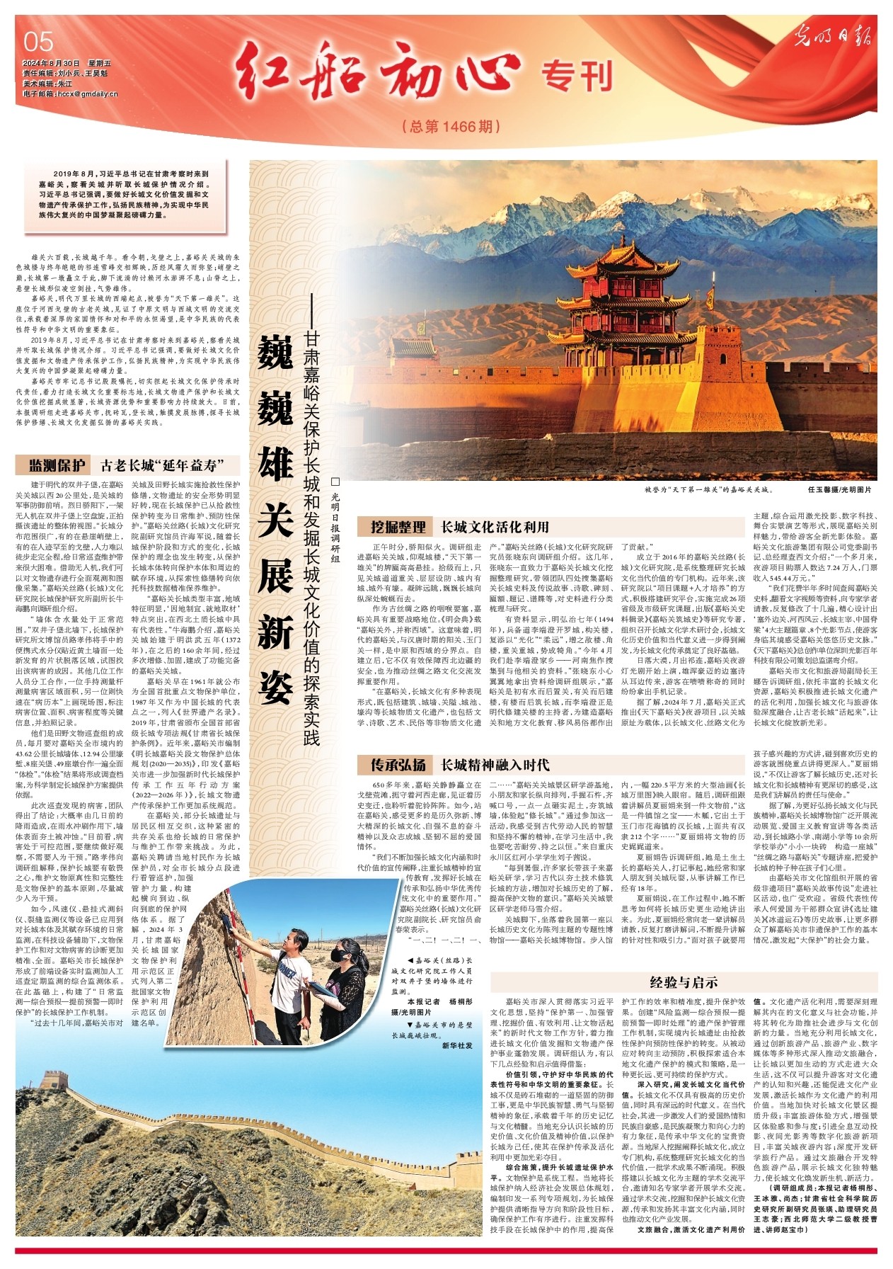 嘉峪關市牢記總書記殷殷囑托,切實擔起長城文化保護傳承時代責任,著力打造長城文化重要標志地,長城文物遺產(chǎn)保護和長城文化價值挖掘成效顯著,長城資源優(yōu)勢和重要影響力持續(xù)放大。日前,本報調研組走進嘉峪關市,撫磚瓦,登長城,觸摸發(fā)展脈搏,探尋長城保護修繕、長城文化發(fā)掘弘揚的嘉峪關實踐。