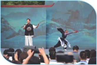 主詩會(huì)現(xiàn)場(chǎng),氣勢(shì)恢弘的武術(shù)表演,精彩絕倫的拿手絕技,美輪美奐的崆峒山景,蕩氣回腸的武林唱響,組成一幅幅震天動(dòng)地的美麗畫卷。伴著《少林,少林》《中國功夫》的歌聲,中岳武校功夫表演團(tuán)數(shù)套行云流水的少林武術(shù),豪氣干云、笑逸蒼茫,一招一式古風(fēng)流存,展現(xiàn)出少林武者英雄豪杰的氣魄與豪邁,演繹了少林武魂的禪武精神。這些平常只能在電影或電視中才可以看到的少林武功,而今就在眼前,觀眾們紛紛報(bào)以熱烈掌聲。武與舞的“對(duì)話”,武與舞的“相遇”詮釋鐵血丹心、俠骨柔情。由平?jīng)鰫郯鹏嵛璧概嘤?xùn)中心帶來舞蹈《王母夜宴》,通過王母夜宴的歡樂場(chǎng)景,將西王母和周穆王相愛的神話故事深情講說,情濃處,千回百轉(zhuǎn),柔腸百結(jié)。一曲《刀劍如夢(mèng)》穿越時(shí)空而來,歌手用獨(dú)特的嗓音,將這首歌演繹得淋漓盡致,將觀眾帶入了一個(gè)感性而深沉的氛圍,帶領(lǐng)我們回到了那個(gè)充滿江湖氣息的瑰麗世界。“滄海一聲笑,滔滔兩岸潮,浮沉隨浪只記今朝,蒼天笑,紛紛世上潮,誰負(fù)誰勝出天知曉滄海笑……”一曲《滄海一聲笑》,營造了一股濃濃的中國俠士逍遙風(fēng),旋律步步低落,先抑后揚(yáng),峰回路轉(zhuǎn),觀眾隨著音樂的意象一步步陷入蒼涼和寂寥中。隨著歌曲的高跌起伏,一個(gè)個(gè)精彩的片段定格為現(xiàn)場(chǎng)觀眾一張張手機(jī)影像。