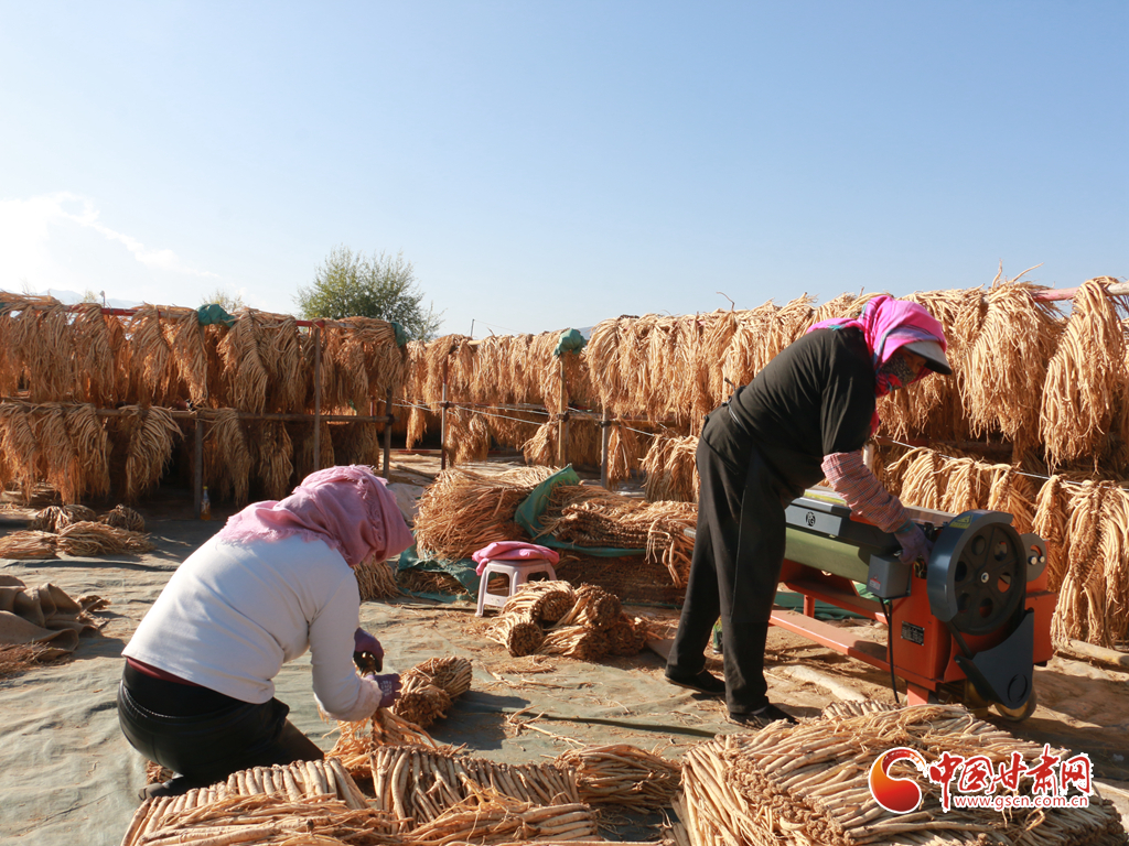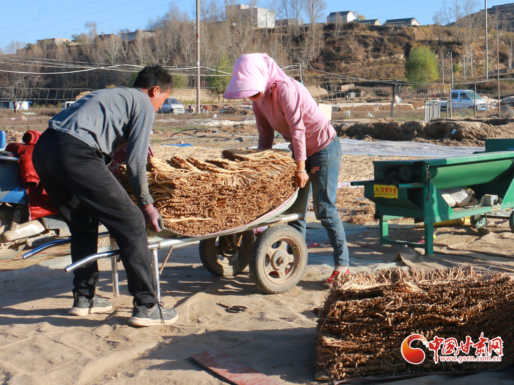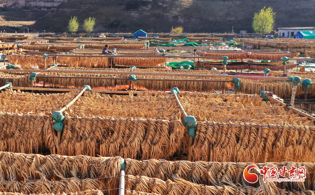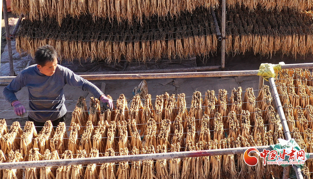 初冬時(shí)節(jié),天氣晴好,走進(jìn)岷縣十里鎮(zhèn),藥香四溢,隨處可見藥農(nóng)利用晴好天氣忙著晾曬中藥材的場景。