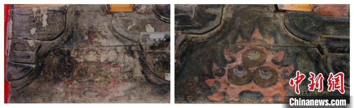 圖為1999年拍攝的長(zhǎng)樂門內(nèi)檐彩畫顏料層顯色加固前后對(duì)比。(陜西師范大學(xué)歷史文化遺產(chǎn)保護(hù)教育部工程研究中心供圖)