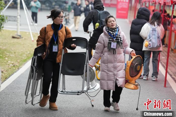 12月21日,2025年全國(guó)碩士研究生招生考試初試開(kāi)考,眾多考生來(lái)到湖南農(nóng)業(yè)大學(xué)考點(diǎn)參考。據(jù)教育部數(shù)據(jù)顯示,2025年全國(guó)碩士研究生報(bào)名人數(shù)為388萬(wàn),相比去年下降50萬(wàn)人,已是連續(xù)兩年報(bào)名人數(shù)下降。圖為志愿者將椅子與取暖設(shè)備送入考場(chǎng)。中新社記者 楊華峰 攝