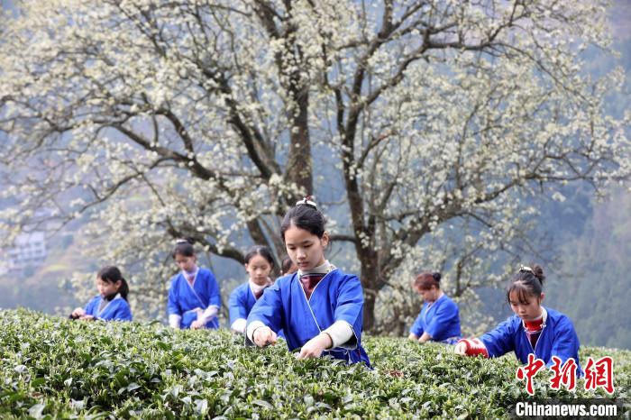 圖為村民在采春茶。龔普康 攝