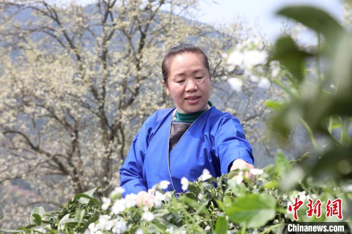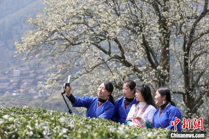3月16日,廣西三江侗族自治縣八江鎮(zhèn)歸令村六更屯種植的千樹梨花迎春綻放,與青翠茶園、特色民居相映成趣,構成一幅如詩如畫的春日畫卷。當?shù)卮迕窦坝慰图娂娗皝聿刹栀p花、“打卡”拍照,享受春日美好時光。圖為村民在采春茶。龔普康 攝