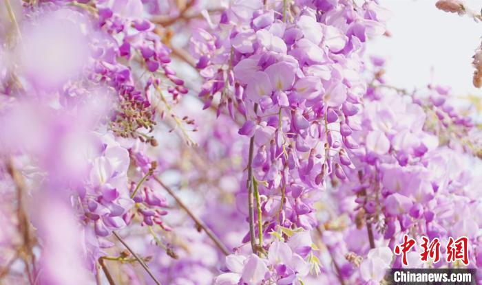近日,廣西賀州市北堤公園的紫藤花迎春盛放,一串串紫藤花垂掛枝頭,花朵飽滿可愛,在綠色枝葉的掩映下,呈現(xiàn)出一派朝氣蓬勃的景象。圖為北堤公園的紫藤花。覃麗華  攝