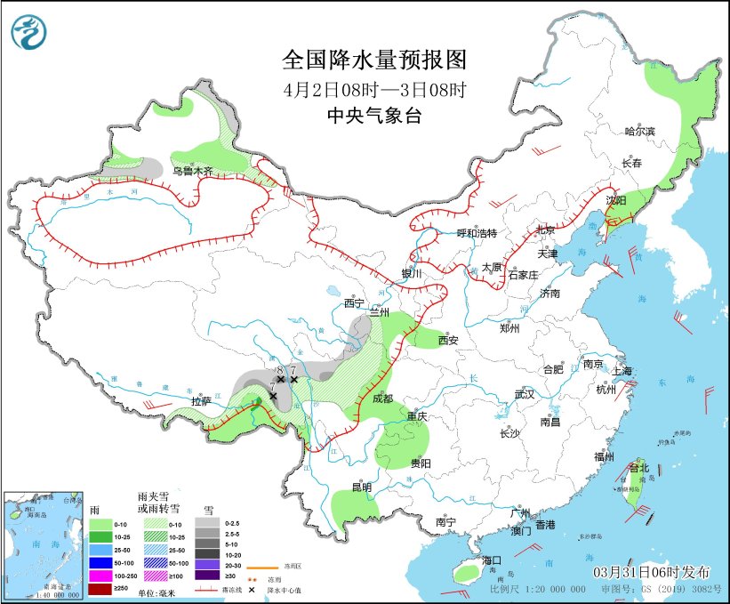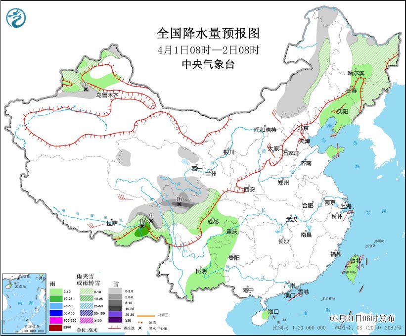 4月1日08時(shí)至2日08時(shí),內(nèi)蒙古東部、黑龍江中東部、吉林東部、遼寧東北部、新疆西北部山區(qū)、西藏東部、青海南部、川西高原北部等地部分地區(qū)有小到中雪或雨夾雪,其中,新疆沿天山地區(qū)、西藏東部、川西高原北部等地部分地區(qū)有大雪,局地暴雪(10~16毫米)。新疆伊犁河谷和北疆盆地、西藏東南部、吉林中部、遼寧大部、山東半島、西南地區(qū)東部和南部、海南島東部、臺(tái)灣島等地部分地區(qū)有小到中雨,其中,西藏東南部等地局部地區(qū)有大雨(25~40毫米)。西藏南部、內(nèi)蒙古中部、遼寧中南部、河北中南部、天津、山西、山東半島、浙江東部等地部分地區(qū)有4~6級(jí)風(fēng),西藏東部部分地區(qū)有6~7級(jí)風(fēng);渤海、渤海海峽、黃海西部、東海南部、臺(tái)灣海峽、臺(tái)灣以東洋面、巴士海峽、南海中北部海域有6~7級(jí)風(fēng),陣風(fēng)8級(jí)。