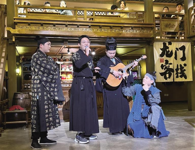 “諸位小友近來可好?”“好!”在街區(qū),NPC們與游客的互動成為一大亮點。為了讓游客更好地沉浸其中,街區(qū)里的“蘭裳閣”專門提供服裝出租和妝造設計服務。游客們在這里換上漢服、做好造型,“穿越”成古人與NPC們共同沉浸在這場歷史旅行中。張偉彥在“龍門客棧”工作快半年了,飾演店小二馬一刀。他對角色有著自己的理解:“導演讓我演店小二,大家印象里店小二都是機靈、腿腳快的。但我演的這個店小二帶著江湖氣息,他藏在龍門客棧,其實是個刀客,在這里打工是為了打探消息,畢竟龍門客??墒墙⒌木奂?。”記者走在街區(qū),時不時就能看到他拿著草帽,熱情地招呼游客玩接帽子游戲。遇到靦腆不敢嘗試的游客,他也會不斷鼓勵,有時候碰上外國游客,他還隨口說幾句英語與其互動。