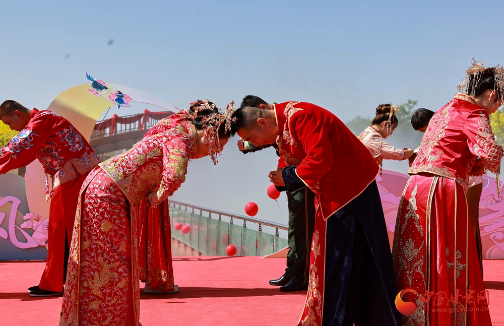 活動(dòng)現(xiàn)場(chǎng),古色古香的布置與悠揚(yáng)婉轉(zhuǎn)的禮樂相得益彰。參加集體婚禮的新郎、新娘走過連心橋,共同牽繡球入場(chǎng),舉行拜天地、行合巹禮等傳統(tǒng)儀式,一揖一禮間盡顯中式婚禮的莊重典雅與浪漫情懷,每一個(gè)環(huán)節(jié)都飽含著對(duì)新人的美好祝福。