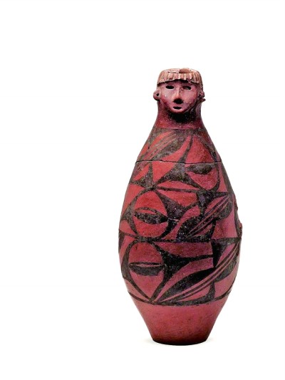 這只彩陶瓶的瓶口,被塑造成一位少女的頭像。她面龐秀麗,齊額短發(fā)整齊利落,發(fā)梢層次錯落,有著現(xiàn)在年輕人喜歡的空氣感。腦后留著披肩發(fā),鼻梁挺直,嘴唇小巧,微微張開,似乎講述著遠(yuǎn)古的故事。少女耳部有穿孔,說明她曾經(jīng)“佩戴耳環(huán)”。少女頭像與渾圓的瓶腹部自然銜接,整體呈現(xiàn)出優(yōu)雅的流線型輪廓。瓶身繪有弧三角構(gòu)葉豆莢紋飾,如同綻放的花瓣包裹著陶瓶。