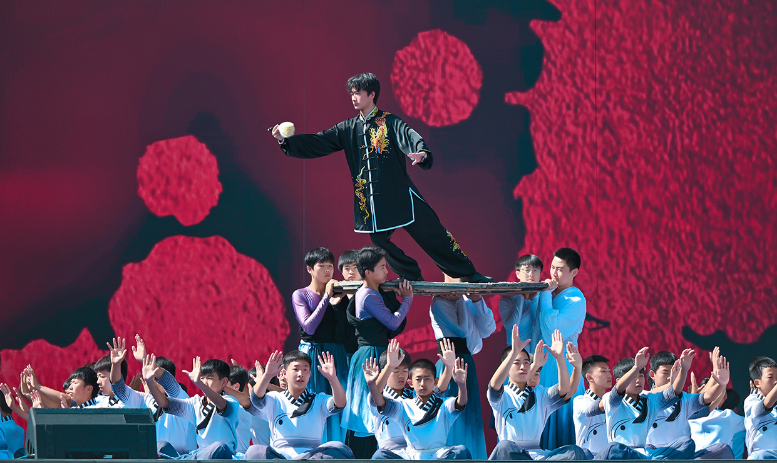 活動伊始,開場片《歡迎乘坐崆峒號》以“環(huán)西部火車游·崆峒號”平?jīng)雎糜螌A袨殪`感,通過跨時(shí)空對話串聯(lián)崆峒山古今脈絡(luò),拉開活動序幕。現(xiàn)場,街舞與崆峒武術(shù)團(tuán)體合作的《武韻崆峒》展現(xiàn)武術(shù)與現(xiàn)代肢體藝術(shù)新生機(jī);笛子演奏與武術(shù)冠軍聯(lián)袂呈現(xiàn)的《崆音劍影》打造“可聽的武術(shù)”沉浸式體驗(yàn);30人陣容的江蘇武協(xié)女子太極拳團(tuán)體演繹《鶴起崆峒》,詮釋武術(shù)新功用;國風(fēng)歌手與秦腔表演藝術(shù)家合作的《秦韻長歌》,展現(xiàn)“武戲同源”的多元魅力。