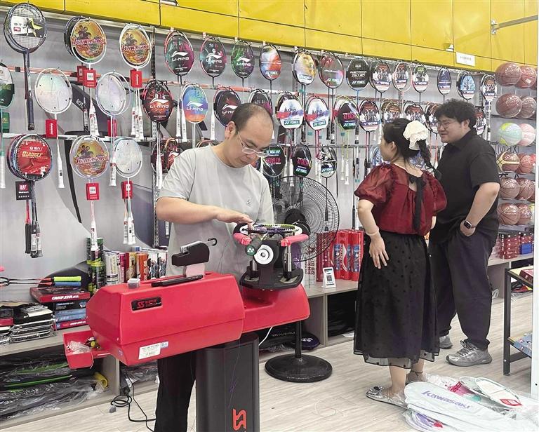 不僅如此,運動用品銷售也迎來小高峰。瑞德摩爾太平洋商場內(nèi)的健雄體育用品店內(nèi),老板正忙著給羽毛球空拍穿線。“我們不僅有現(xiàn)成的羽毛球拍,還可以根據(jù)客戶的需求給空拍穿線。”該店老板介紹,羽毛球拍網(wǎng)線價位30至100元不等,購線還可免手工費。羽毛球初學(xué)者一般都會買成品拍自己在家練習(xí),而一些技術(shù)較好的顧客除了會選擇品質(zhì)較好的空拍,還會現(xiàn)場選線拉網(wǎng)定制屬于自己的球拍。“暑假以來,店內(nèi)羽毛球拍銷量大增,穿線需求也逐漸增多,周末從早忙到晚,每半小時穿一個球拍,最多一天穿24個,排隊等候已成常態(tài)。”此外,不少運動品牌也順勢推出促銷活動,吸引消費者選購。