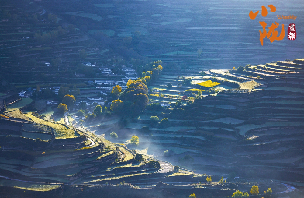 秋末初冬,多彩秋色映照著美麗的臨潭。五彩斑斕的梯田縱橫交錯、順山而變,宛如一條條彩帶,在山間飛舞。村落點(diǎn)綴其間、古樸自然,田園生活詩意盎然。