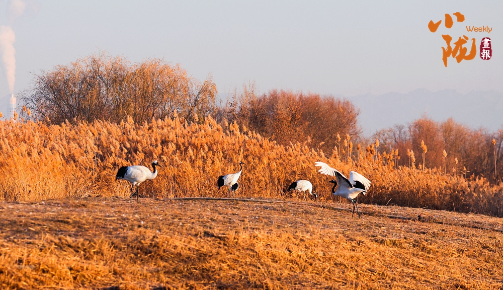 丹頂鶴時(shí)而凌空飛舞,時(shí)而散步、覓食,穿梭在金黃的蘆葦間。