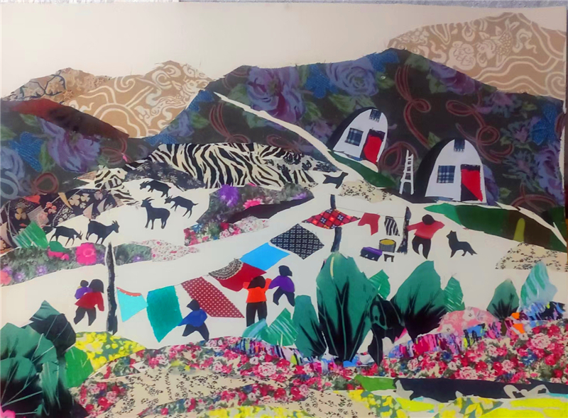 裁剪環(huán)節(jié)更見功力。她以“銳利”之心駕馭剪刀,根據(jù)畫面需求將碎布剪成不同形狀,有的需棱角分明,有的要圓潤柔和。粘貼時(shí),她摒棄簡(jiǎn)單的粘合方式,采用傳統(tǒng)縫補(bǔ)與現(xiàn)代鑲嵌相結(jié)合的技法,讓布料與底板緊密貼合,既保證了作品的耐久性,又營造出自然的浮雕感。在《黃土風(fēng)情》布貼畫中,她用層層疊疊的碎布表現(xiàn)黃土高原的溝壑縱橫,用深淺不一的色塊勾勒窯洞的錯(cuò)落有致,指尖翻飛間,碎布頭便有了筋骨與神韻。